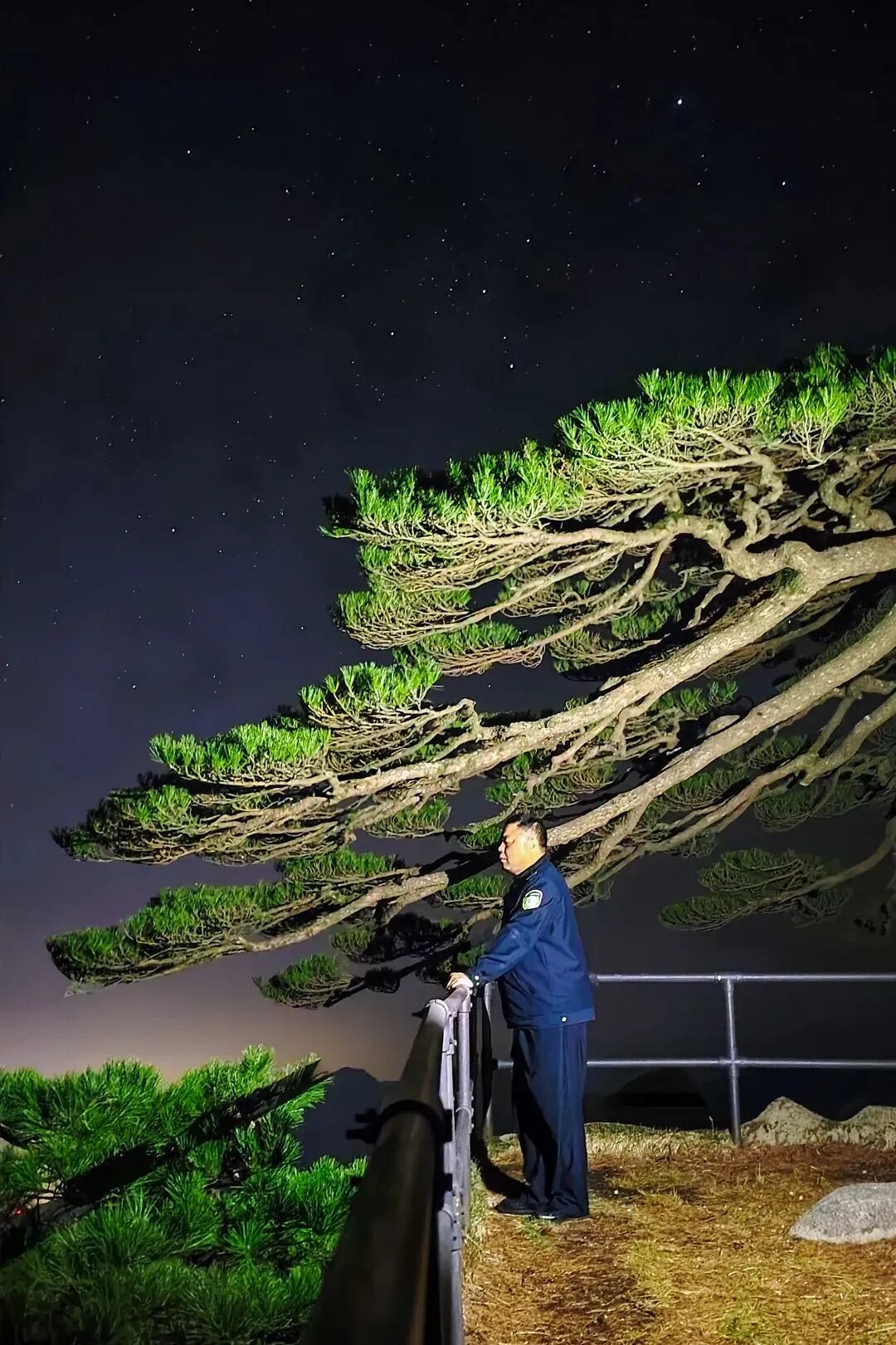 迎客松下,第19任守松人胡晓春微闭双眼,静静聆听风声、雨声,万壑松涛。“就像一场交响乐。”胡晓春说,一人一松,夜听松吟,这是游人散去之后,独属于他的浪漫时刻。