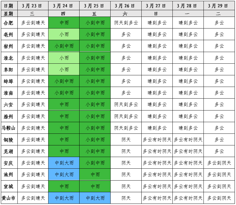 24日(周四):全省多云转阴天。淮北地区有小到中雨;淮河以南有中雨,其中大别山区和皖南山区大雨。