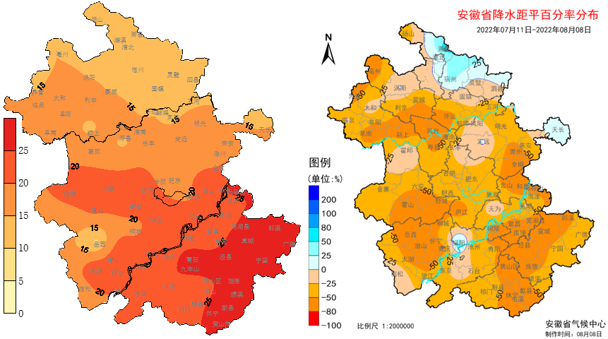 出梅以来安徽省呈现高温少雨的天气特征,预计8月9日至9月7日全省累计降水较常年偏少,期间将有2次降水过程,出现在8月15日夜里-18日(沿淮淮北)、24-26日(全省)。其中23日前全省仍将出现大范围高温天气,9-15日全省、16-22日沿淮淮河以南最高气温可达37~39℃,部分市县超过40℃。