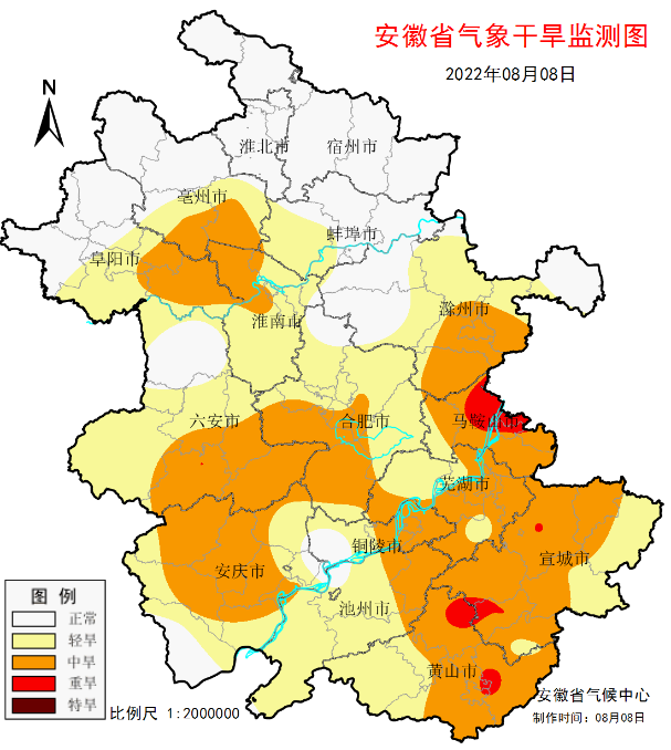 出梅以来安徽省降水较常年偏少近4成,预计8月23日前淮河以南无有效降水,且有大范围持续性高强度高温天气,将导致淮河以南气象干旱快速发展,高温干旱叠加将给各行业带来一系列不利影响。