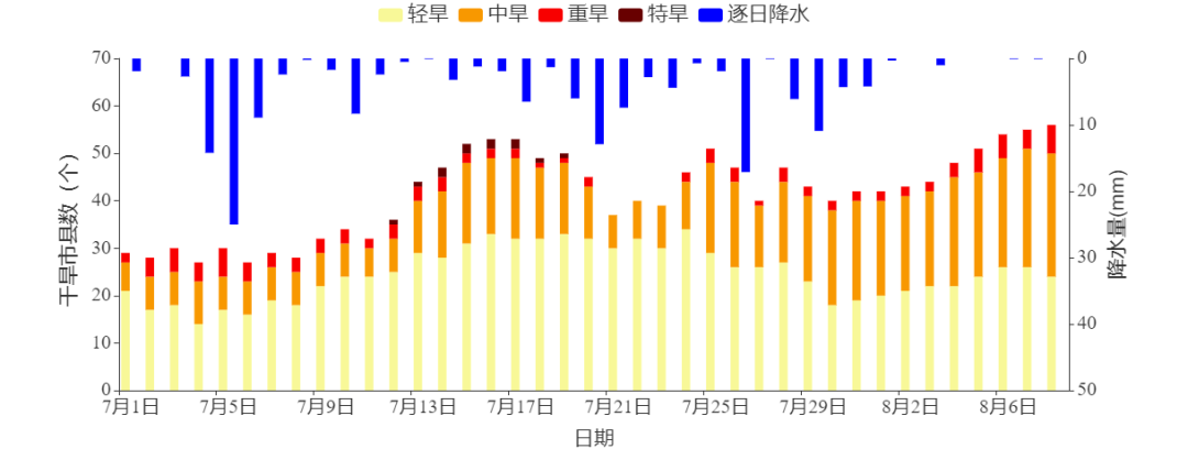 图2 7月1日-8月8日不同等级气象干旱站数和降水量逐日演变