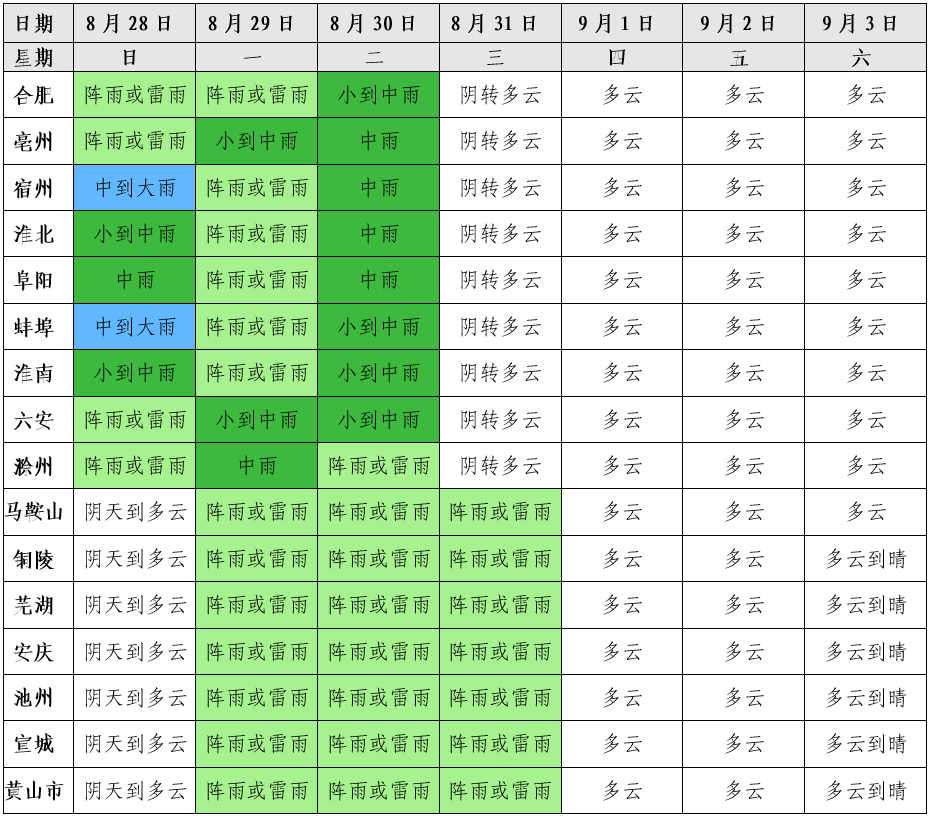8月31日前我省多阵雨或雷雨天气,其中28日沿淮淮北部分地区有中到大雨,局部暴雨;29-30日江北部分地区有中雨。9月1-6日全省以多云天气为主。此外29-30日沿江江南有局地短时强降水、雷暴大风等强对流天气。