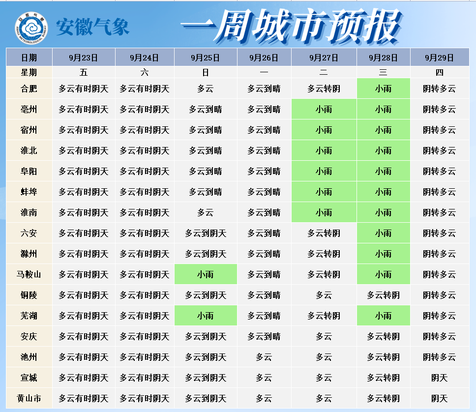 25日(周日):淮北地区多云到晴天;淮河以南多云到阴天,大别山区和沿江部分地区有小雨。