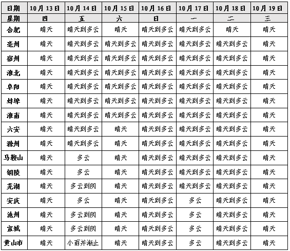 预计未来一周我省以晴到多云天气为主,13-16日我省气温逐渐回升,全省大部分地区最高气温22~25℃;受冷空气影响,17-18日我省平均气温将下降5~8℃,同时16夜间-17日偏北风力将增大到3~4级,阵风7级;冷空气过后,18-19日早晨淮北地区最低气温3~6℃,淮河以南6~9℃。