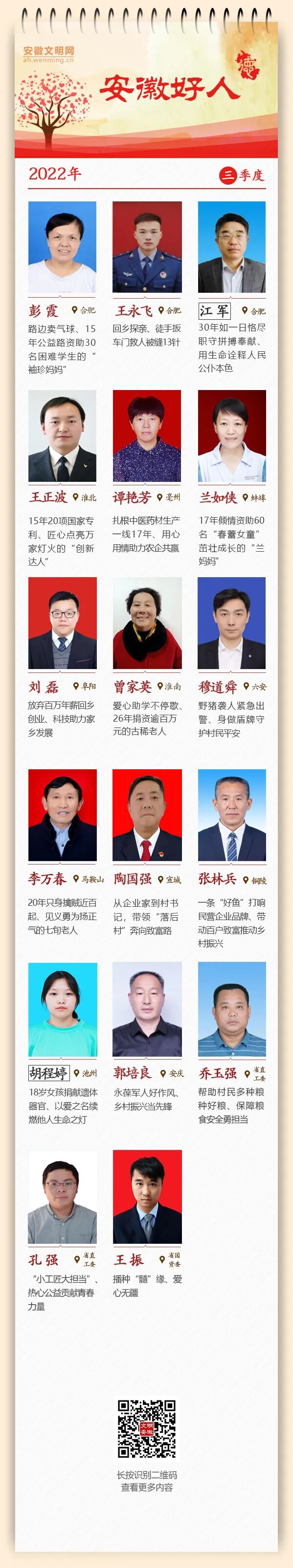 经公众推荐、专家评议和社会公示,彭霞等17组(17人)入选三季度“安徽好人”。他们是: