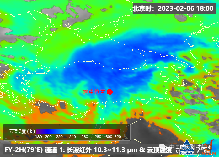 ▲ 卫星长波红外增强监测图显示,震中及周边区域受高空冷涡影响,该区域云顶亮温最低值小于-50℃。