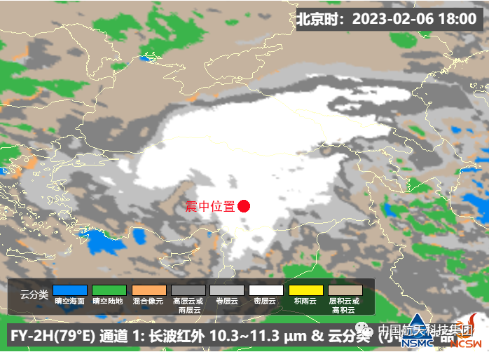▲ 卫星云顶温度和云分类产品显示(以上两图),土耳其大部分地区上空云团温度较低,震区上空目前仍有对流云系发展,云顶温度低于220k,云类型以密层云为主。