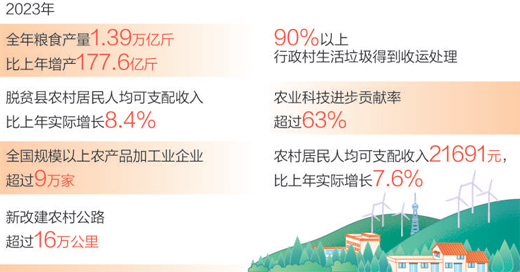 2023年,在以习近平同志为核心的党中央坚强领导下,我们克服较为严重的自然灾害等多重不利影响,粮食产量再创历史新高,农民收入较快增长,农村社会和谐稳定,为推动经济回升向好提供了有力支撑。