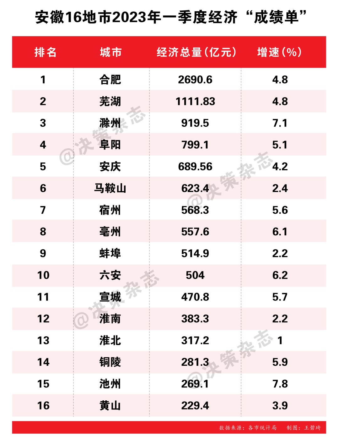 01 经济格局保持稳定 经济总量前三名未变 从经济总量看,合肥一马当先,继续领跑全省,经济总量达到2690.6亿元。 芜湖排在第二位,经济总量达到1111.83亿元,滁州坐稳第三位,经济总量达到919.5亿元。 阜阳位居第四,经济总量为799.1亿元。安庆位列第五,经济总量为689.56亿元。马鞍山以623.4亿元排在第六位。宿州排在第七位,经济总量为568.3亿元。亳州位列第八位,经济总量为557.6亿元;蚌埠排在第九位,经济总量为514.9亿元。六安排在第十位,经济总量为504亿元。 从全省来看,与2022年相比,经济格局整体保持相对稳定。 02 池州领跑,滁州紧随 从经济增速来看,池州以7.8%的增速高居全省第一,滁州增速位居第二,达到7.1%。这是全省仅有的两个增速超过7%的地市,跑出发展“加速度”。 决策杂志注意到,一季度滁州经济运行稳中向好,投资保持快速增长,市场消费不断回暖,营商环境持续优化,总体上延续了向上向好的发展态势,交出了首季“开门红”的优异答卷。在安徽省“季度赛马”评议中,经济运行连续5个季度全省第一、营商环境连续4个季度全省第一。 六安增速达到6.2%,位居第三,亳州增速达到6.1%,位居第四。 决策杂志梳理发现,在5%-6%的增速区间,地市数量最多,有4个地市。具体来看,铜陵增速达到 5.9%,宣城为5.7%,宿州为5.6%,阜阳为5.1%。 这8个地市都跑赢了全省增速4.8%。 合肥、芜湖与全省持平,增速同为4.8%。 与全国经济增速相比,10地市跑赢全国增速4.5%。这10个市分别是池州、滁州、六安、亳州、铜陵、宣城、宿州、阜阳、合肥和芜湖。 决策杂志注意到,全省16个地市均实现了正增长。 03 向池州、滁州学什么? 又是池州、滁州! 决策杂志梳理发现,从2022年以来,池州、滁州两市的经济增速连续多个季度排名全省前列,尤其是池州排名全省第一,由此产生一个奔“池”速度的流行语。 池州、滁州为什么快?深入分析,两市至少有三条经验值得学习。 一是善作为。两市的干部队伍拼劲很足,不断增强发展的紧迫感,展现了迎难而上、乘势而上、积极进取的工作作风。 二是抓机遇。池州、滁州都处在皖江城市带,正全面深度融入长三角一体化,两市积极抢抓经济恢复重要窗口期,牢牢抓住战略机遇、区位机遇、政策机遇,奋力将机遇转化成发展优势,取得明显成效。 4月6日,安徽省委书记韩俊在滁州调研时强调,推进长三角一体化发展是当前安徽面临的最大红利、最大势能,要借东风、搭平台、抓机遇,全力支持中新苏滁高新技术产业开发区建设,推动产业深度对接、集群发展,打造省际合作的典范,成为长三角地区高质量一体化发展的引领性、标志性成果。 三是招大商。两市都坚持把大招商、招大商摆在重要位置,牢固树立“项目为王”理念,锲而不舍抓项目,引进了一批牵动性强的大项目好项目,以项目大突破为经济高质量发展集聚动能。 2023年1至3月份,滁州市新签约亿元项目161个,其中30亿元以上项目10个;新开工亿元项目94个,其中5亿元以上工业项目22个,比2022年同期增加2个;新投产亿元项目75个,比2022年同期增加13个。 一季度,池州市固定资产投资增长21.1%,比安徽省快13.2个百分点,居安徽省第2位。其中,工业投资增长51%,比安徽省快30个百分点,居安徽省第3位。 这是滁州、池州两市经济增长快速的主要密码,值得其他地市学习借鉴。 2023年是全力拼经济的一年,当前,安徽正处于厚积薄发、动能强劲、大有可为的上升期关键期,安徽16地市都要强化抢的意识、拼的劲头,坚定信心、乘势而上、奋勇争先,圆满完成各项目标任务,全力推动现代化美好安徽建设取得更大进展。 |