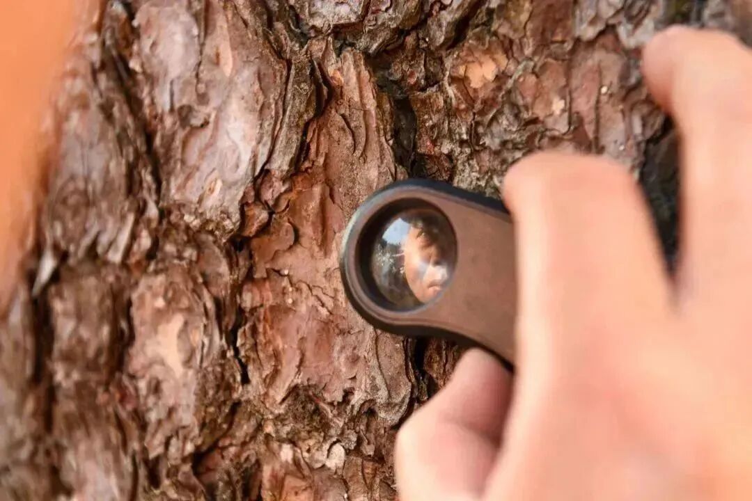 胡晓春用放大镜细察鳞片状的树皮表面有无破损。