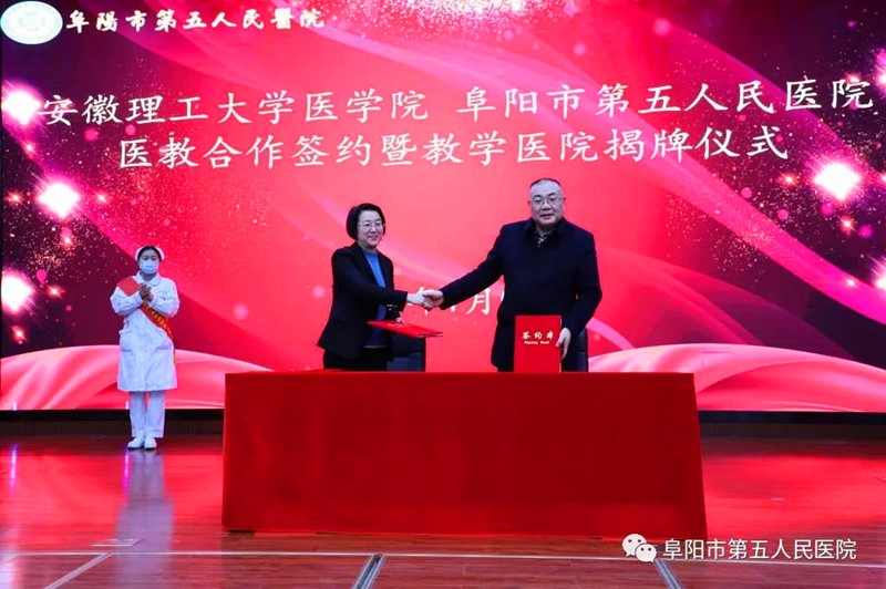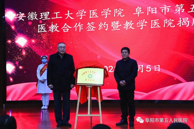 2021年1月5日,阜阳市第五人民医院与安徽理工大学医学院签订了医教合作协议,并对新诞生的教学医院举行了揭牌仪式。安徽理工大学纪委书记周旭、医学院党委书记刘群江、副院长李文月、教学秘书朱涛、团委书记尤佳锋、阜阳市卫健委副主任马振华、颍泉区人民政府副区长李保生、颍泉区卫健委主任刘伟、市五院党委书记姚智敏等人参加了次揭牌仪式。
