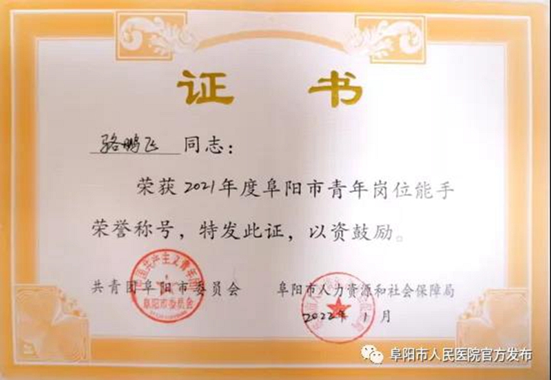 为展现青年风采,树立青年典型,激励广大青年职工立足本职岗位,练就过硬本领,塑造青年的文明形象,同时营造尊重劳动、尊重知识、尊重人才的良好社会氛围,共青团阜阳市委员会、阜阳市人力资源和社会保障局联合开展2021年度阜阳市青年岗位能手评选。根据组织推报、资料审核以及专家评审,最终阜阳市人民医院青年医生骆鹏飞荣获2021年度阜阳市“青年岗位能手”荣誉称号。