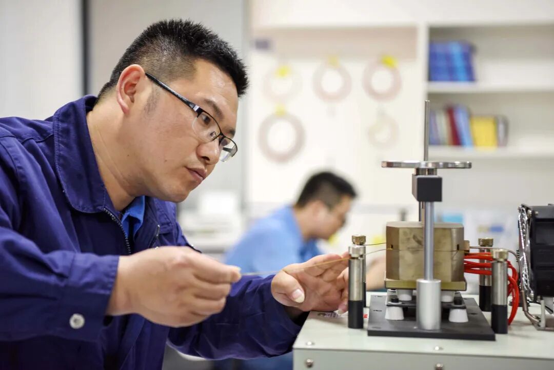 不懂就学,苏保信的身上有股“钻劲”。漆包线是冷门知识,当时唯一的学习资料,就是公司发的一本《漆包线》教材。苏保信把它随身带在身上,只要一有空闲,就捧着看。生产车间的设备24小时开机,每天下班后,苏保信都会留在车间里,盯着机器看,向老师傅虚心求教。“看”了几个月,他从干杂活的辅助工转岗成了操作工。 2004年,铜陵精达在公司内部招检测员。听到消息,苏保信心动了:到检测部门可以接触到更多设备,学到更多技术。经过层层选拔,苏保信如愿进入检测中心,但他当时是被安排做“复绕”这一辅助工作。苏保信没有因此而失望,而是边干“复绕”边学习,钻研的脚步从未停滞过。
