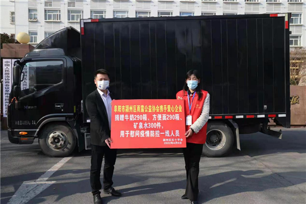 据颍州区雨露公益志愿者协会党支部书记、协会执行会长陈晓宇介绍,根据阜阳市新冠肺炎疫情防控第6号通告,对阜城部分街道、小区实施静态管理,牛奶、方便面、矿泉水等正是各社区一线防控疫情的工作人员急需的防疫生活物资。