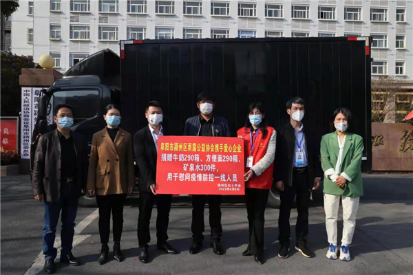 根据颍州区各街道办事处一线防控疫情的工作人员的生活需要,雨露公益志愿者协会携手上述两家爱心企业集中采购290箱牛奶、290箱方便面、300箱景田百岁山水,于4月6日下午将这批急需的生活物资定向捐赠给颍州城区五个街道办事处,为一线防疫人员提供一份急需的生活保障。