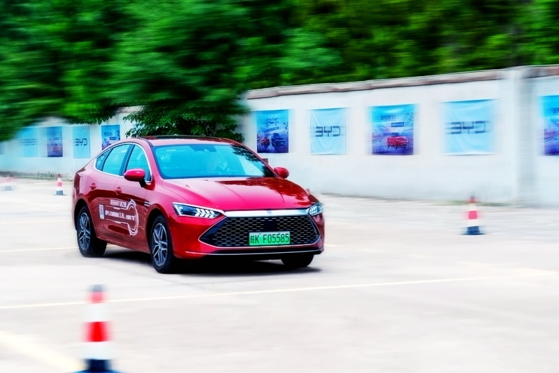 试驾活动现场在阜阳万顺驾校进行,记者首先受邀在赛道上进行S弯蛇形的驾驶。对于秦PLUS DM-i的首先感受就是它的外观,Dragon Face凌厉前脸、箭形的大灯、秦PLUS特殊的LOGO、流线型车体…整车充满力量与科技感,具有很高的辨识度,也更符合广大年轻消费者的审美。