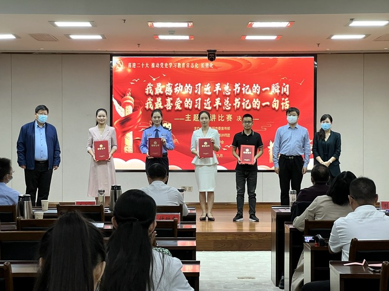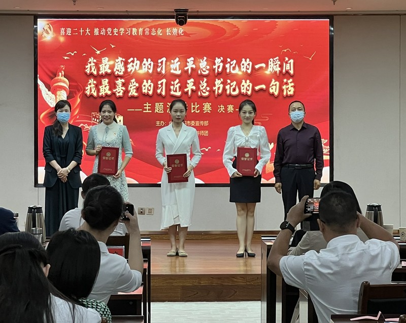 9月23日上午,中共阜阳市委宣传部、中共阜阳市委讲师团携手阜阳市演讲学会开展的“我最感动的习近平总书记的一瞬间 我最喜爱的习近平总书记的一句话”主题演讲比赛决赛在市委综合楼会议厅举行。市委常委、宣传部部长 白晓云、市委宣传部副部长 燕少红、市委副秘书长、市委政研室主任 王文斌等人出席了活动。